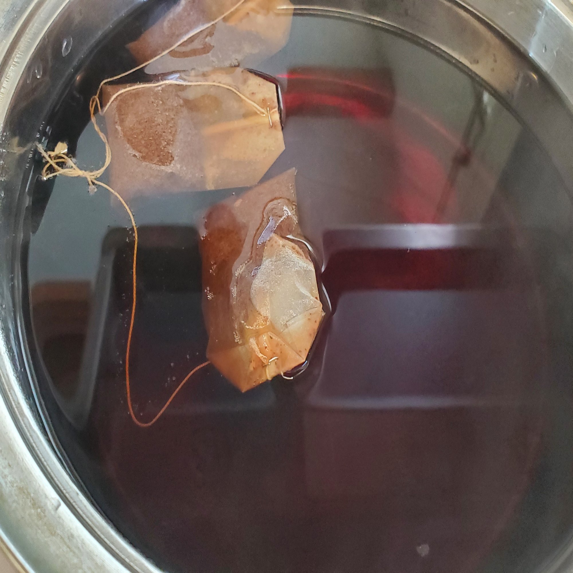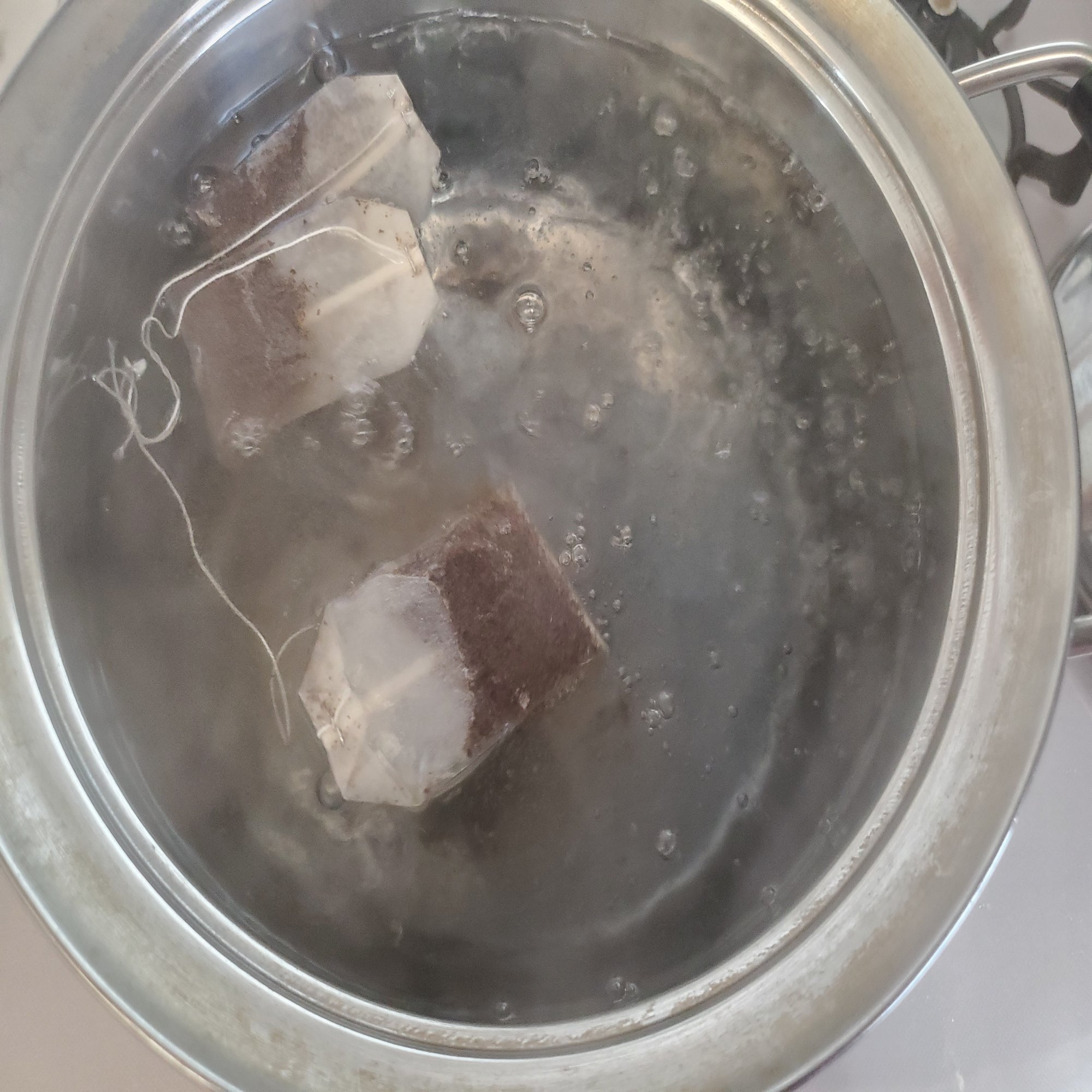 アイスティー手順2 水が沸騰したら蓋をあけて紅茶のティーバッグ3個を静かに入れ、すぐ蓋をする