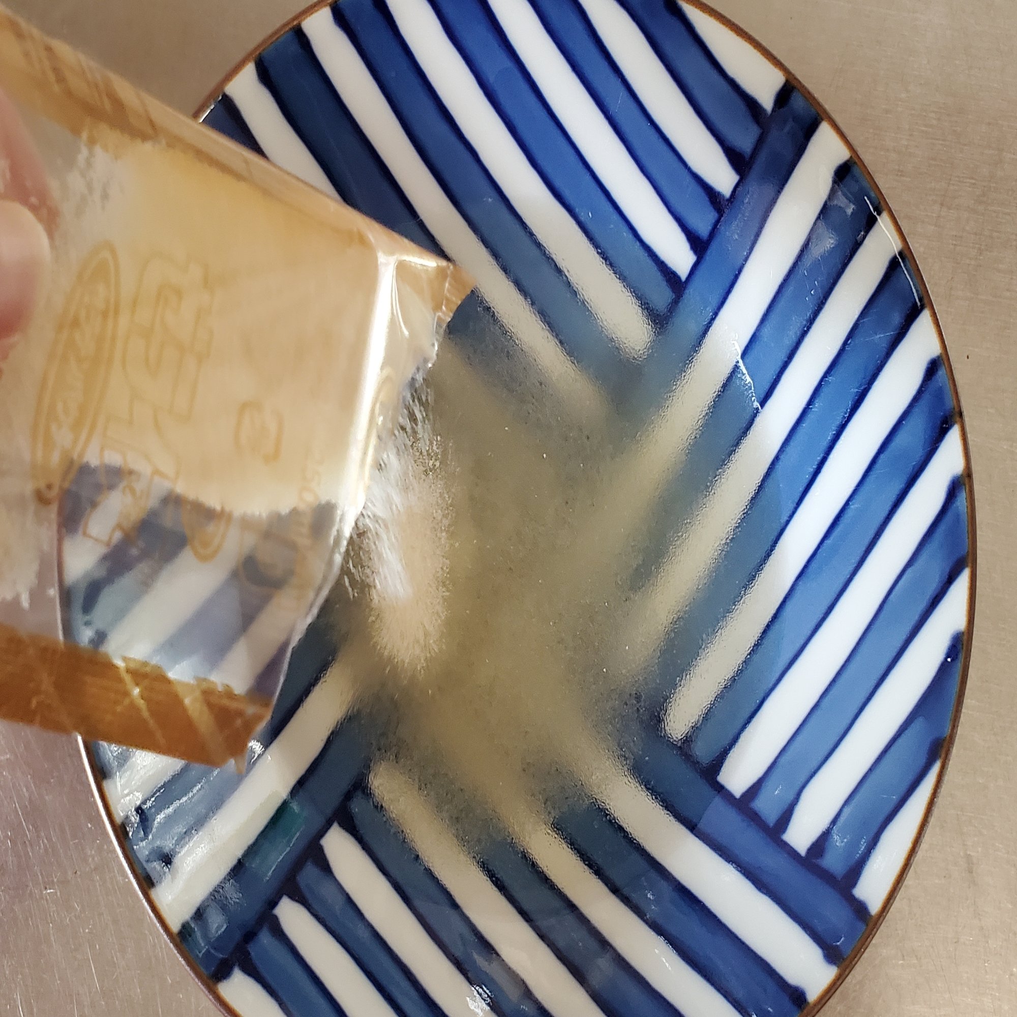ゼリー手順2 ご飯茶碗程度の容器にゼラチンふやかし用の水を張り、粉ゼラチンを水に振り入れてふやかしておく