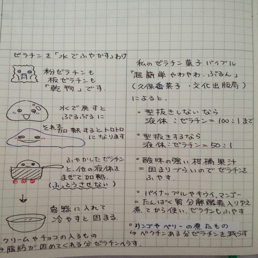 最近の粉ゼラチンは「熱い液体にそのまま振り入れても簡単に溶けてダマにならない!」が売りのものも多いけれど、それでもひと手間かけて「水でふやかす」工程を入れる方が失敗しないよ! あとこれ当番がむかしツイートした「ゼリーのコツ」につけたメモ画像!