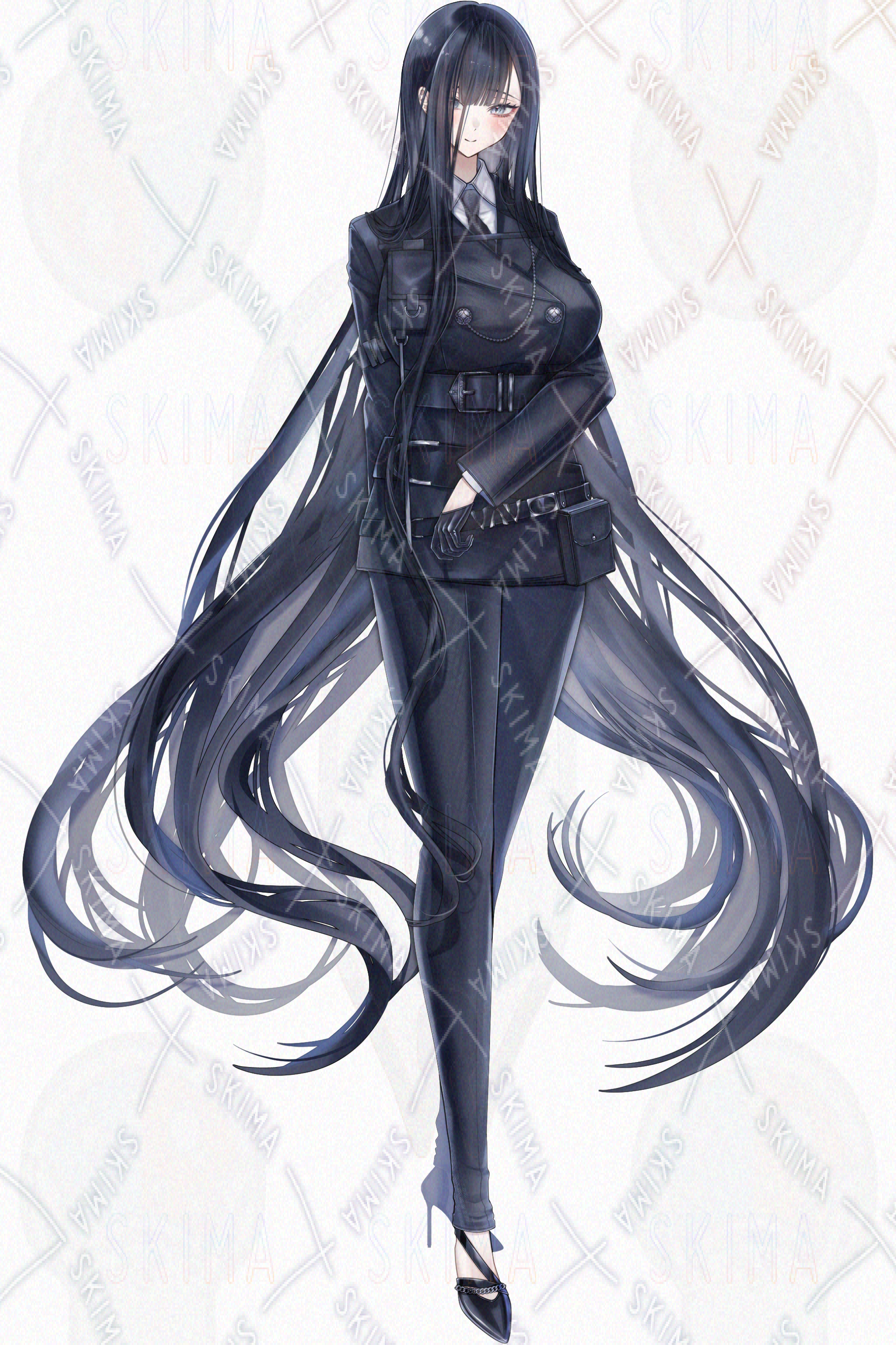 黒髪/ロングヘア/スーツ/ネクタイ/革手袋/刀/日本刀/女性/黒/白