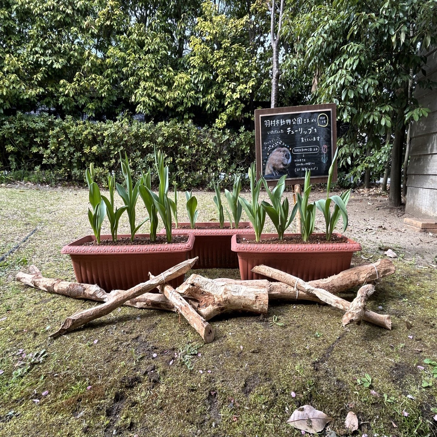 そう、こちらがふるさとのおはなというわけです(伏線回収!)。つい最近、綺麗に咲いてくれました。プランター周辺のレイアウトは、ビーバー達がかじった木です。かじった痕がたくさんついているので、ぜひ観察してみてください。