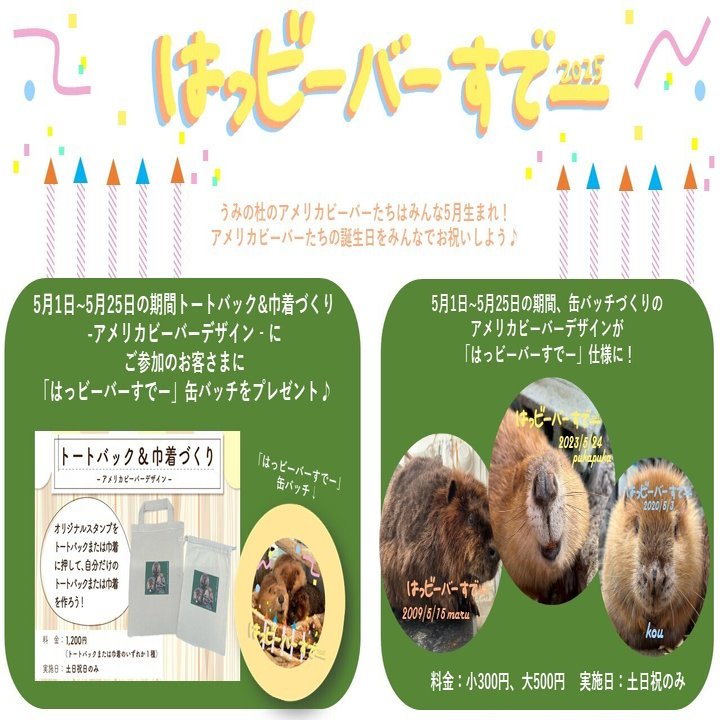 さらに、「缶バッチづくり」のアメリカビーバーデザインも新しい写真で「はっビーバーすでー2025」仕様になっておりますので、ゲットしてくださいね!