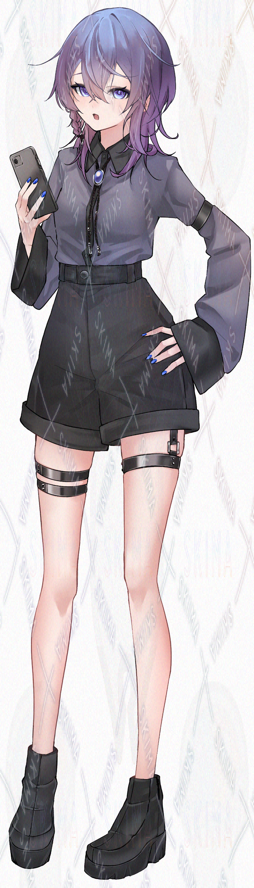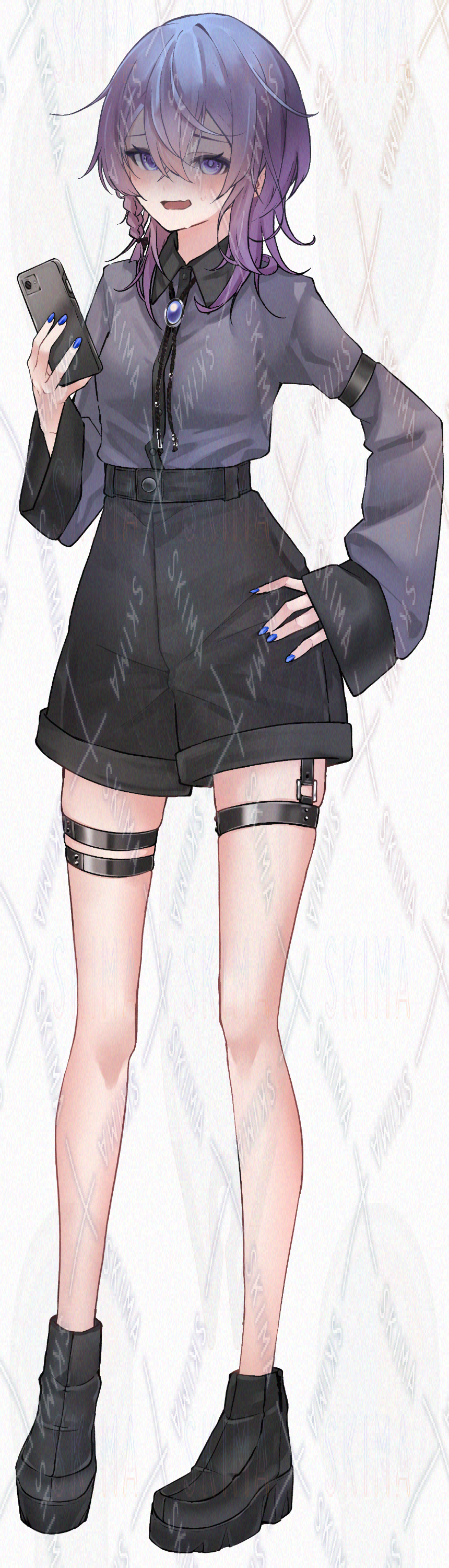 要素:紫髪,三つ編み,ショートパンツ,犬歯,ネイル(青),ウルフ気味,スマホ,ループタイ,厚底,ベルト,青紫の目