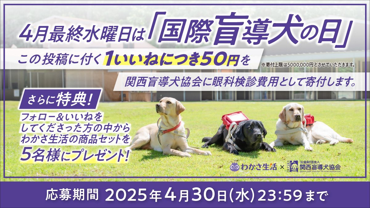 / 4月最終水曜日は「国際盲導犬の日」 1いいねにつき50円寄付します! \ 盲導犬が視覚障がい者の方を安全に誘導するお仕事を全うできるよう実施される眼科検診。こちらの費用として関西盲導犬協会に寄付させていただきます 皆さん、いいねでご参加ください また、WAKASA&Co.京都四条店、えほん生活WAKASA&Co. BOOKS名古屋伏見店 各店舗では4月12日より先着にてステッカーをお渡しいたします。 【期間】 4月30日(水)23:59まで