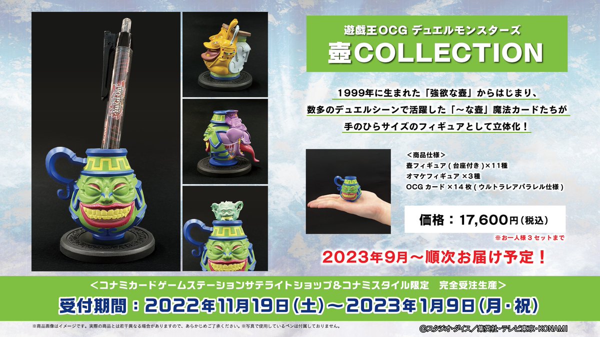 「壺」カードたちが 手のひらサイズの フィギュアとして立体化❗️ ━━━━━━━ 壺𝐂𝐎𝐋𝐋𝐄𝐂𝐓𝐈𝐎𝐍 ━━━━━━━ ✅コナミスタイル予約注文 www.konamistyle.jp/products/detai… ✅サテライトショップ詳細 www.konami.com/games/card/cgs/ ✅発売日 2023年9月~ ✅注文受付期間 注文締切まであと40日 pic.twitter.com/JJOPkOU73T