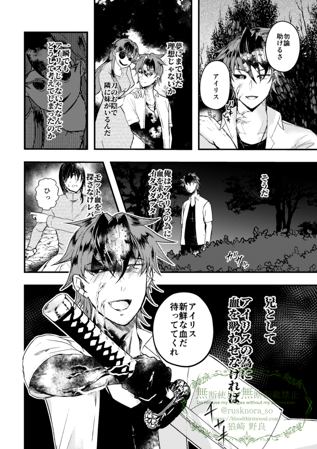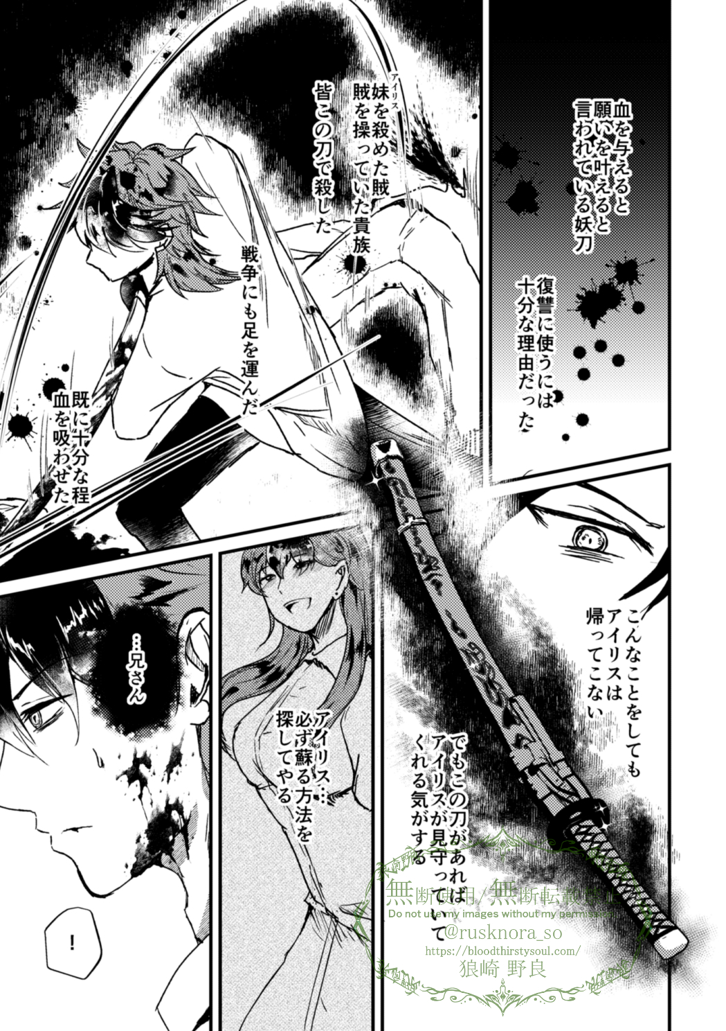 妖刀と妹(2/2) 4-6P 「あぁ、使う時はくれぐれも気をつけろよ。心が弱ければ喰われて人成らざる者へと変貌してしまうらしいからな。噂は当てにしてはいけないよ。」 死者を蘇らせることなんてできやしないんだからな