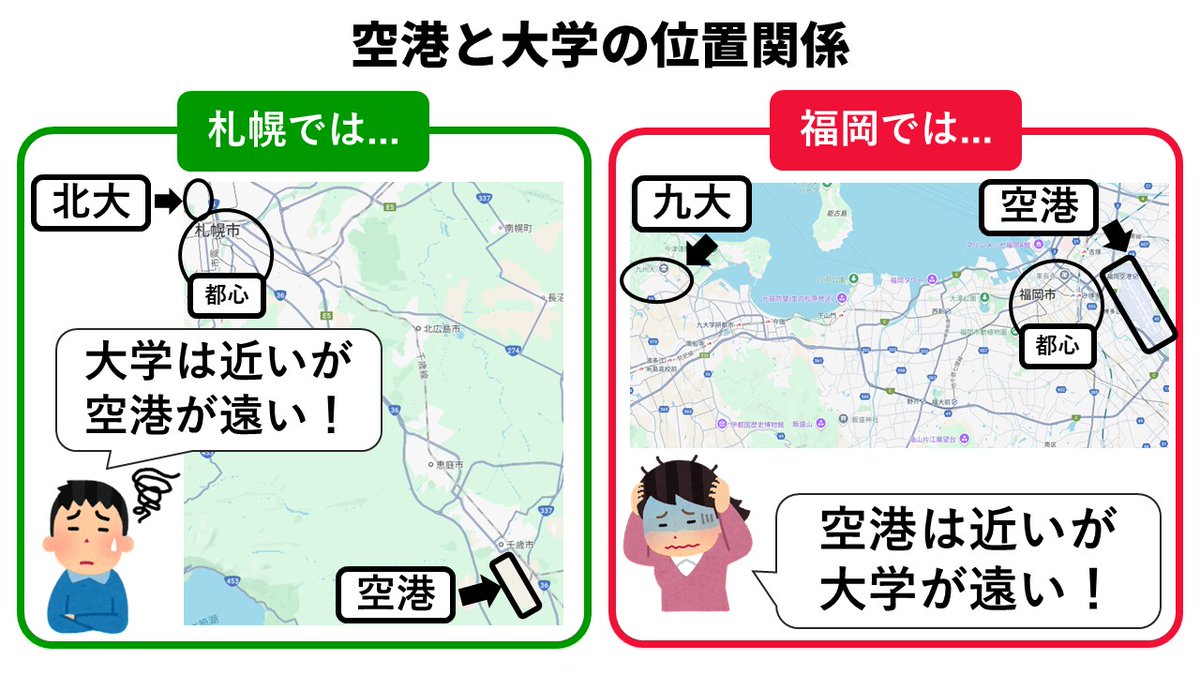 札幌と福岡 空港と大学の位置関係
