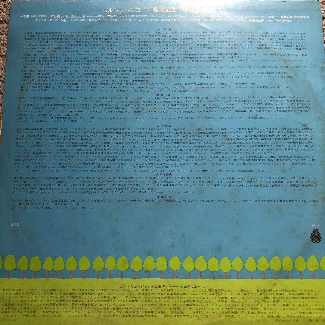 音楽プロデューサーの三浦光紀さんがキングレコード内に立ちあげたレーベル「ベルウッドレコード」を、この記事を読む皆さんならご存知でしょう。第1弾リリースは1972年4月25日(あがた森魚、六文銭)ですが、レーベル発足記念で関係者配布用に制作された非売品レコードがあります。それが『ベルウッドレコード発売記念 特別ダイジェスト』。収録アーティストは友部正人、あがた森魚+はちみつぱい、山平和彦、六文銭、高田渡。リリース日はわかりませんが、第1弾の前でしょうから1972年3月~4月前半頃でしょうかね?