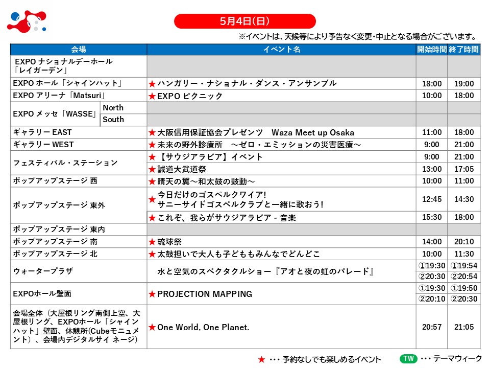 5月4日(日・祝)の万博情報です