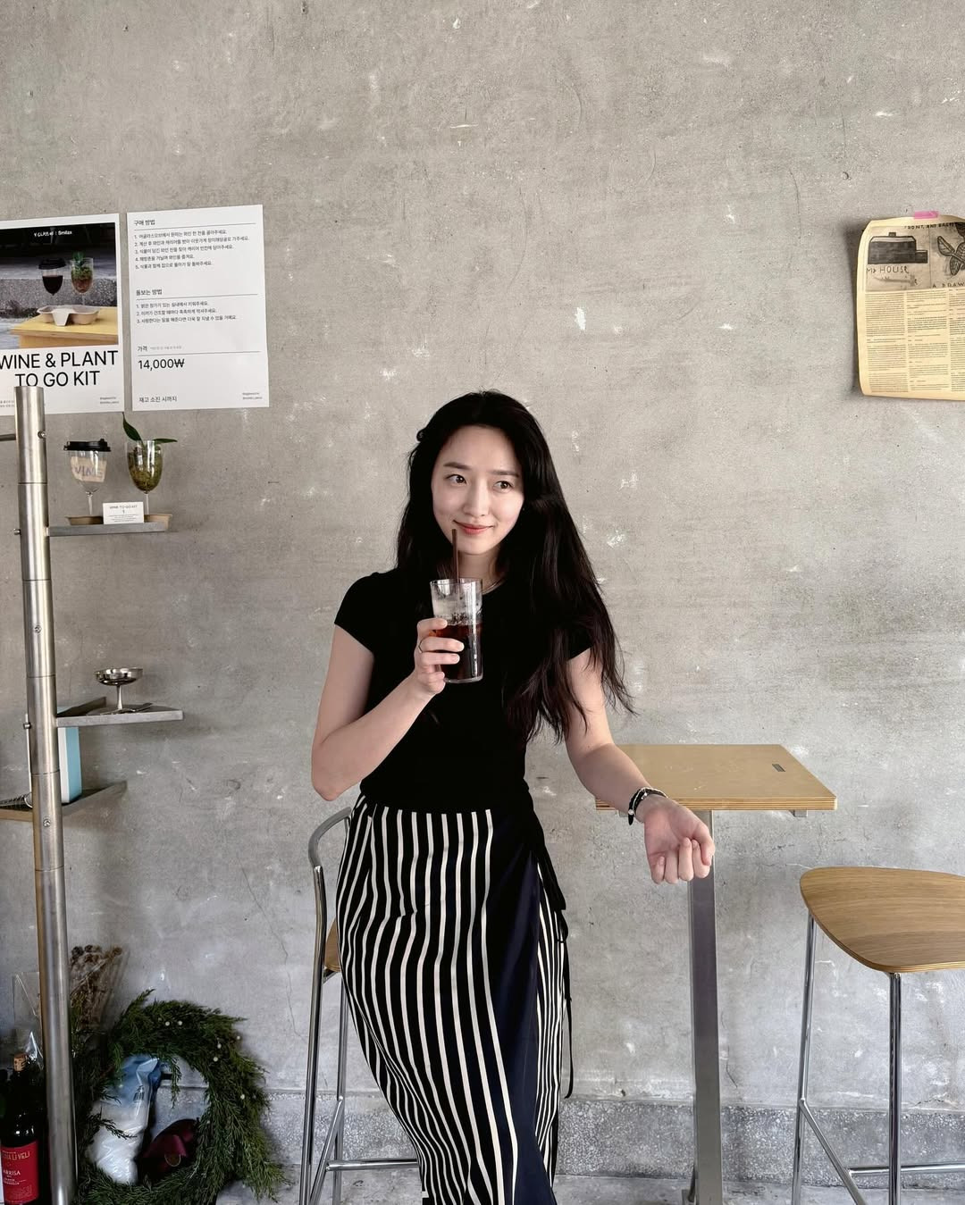 기본 블랙 반팔티에 과감한 흑백 스트라이프 랩스커트를 매치해 시선을 아래로 끌어주는 룩.