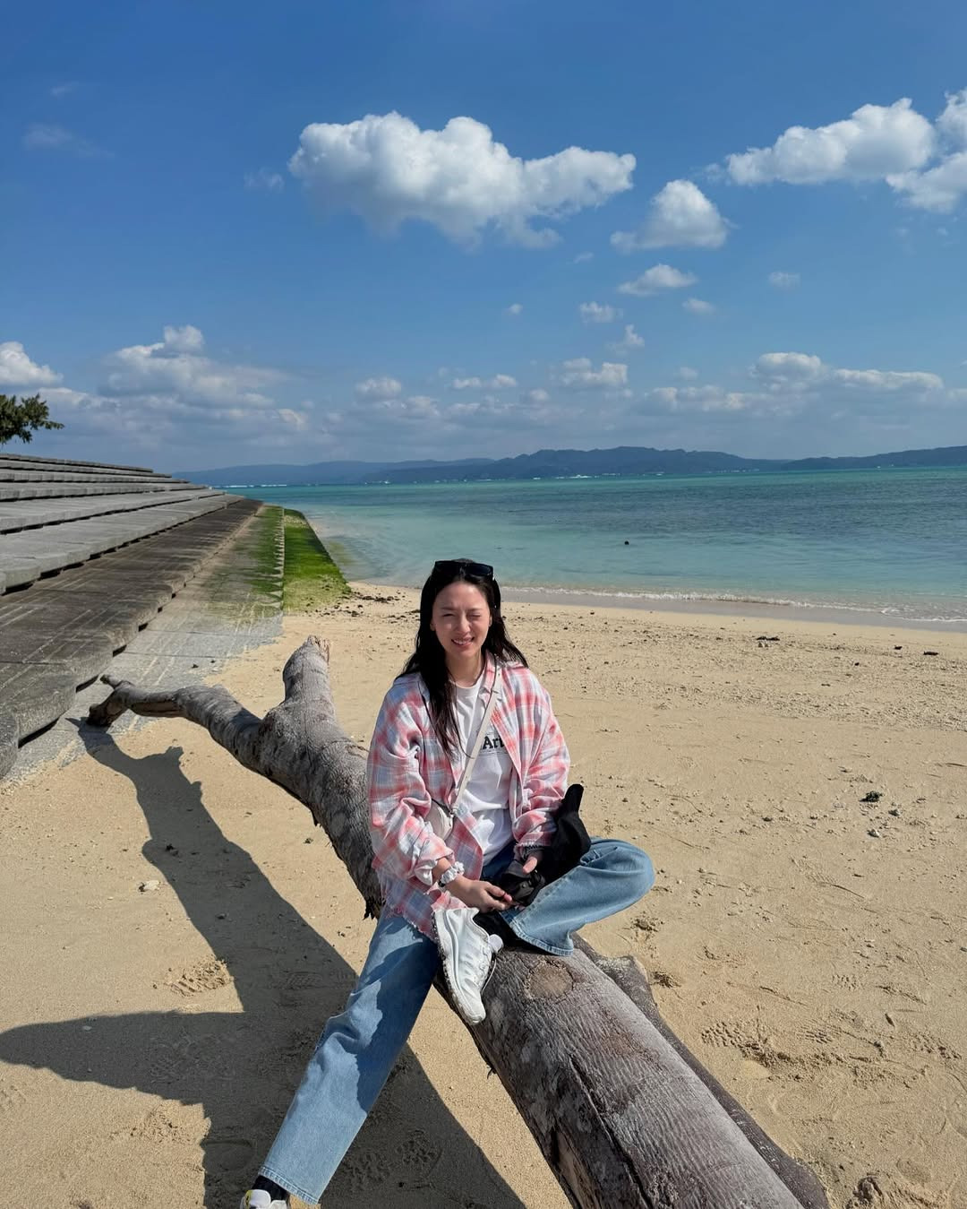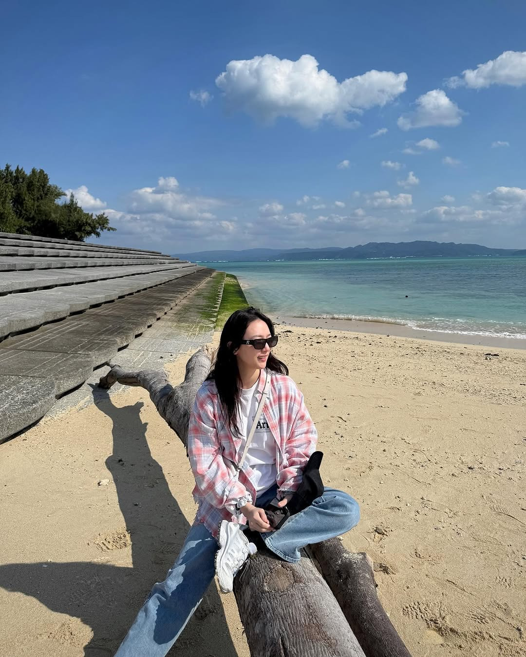 오버핏 셔츠는 체형을 커버하면서도 바람에 흩날리는 여유로움을 느끼게 해주고,흰 운동화와 크로스백으로 실용성과 활동성까지 고려한 모습이었어요.