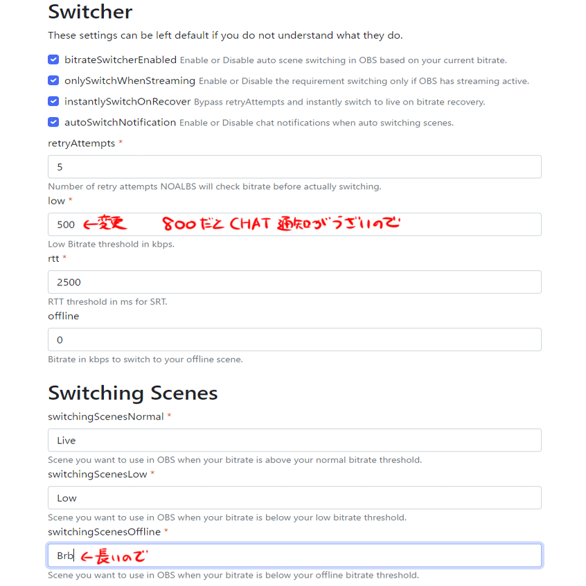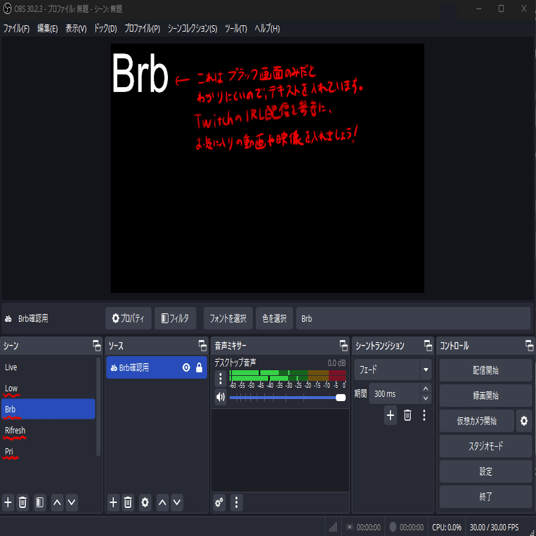 ちなみに”Low”"Brb"には"Live"メディアソースをコピーして貼り付けておいた方が良いです。テキストが隠れないように下に移動してください。