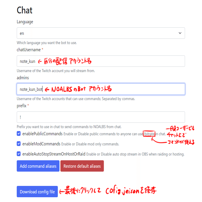 ChatUsernameに自分が配信してるアルファベットの方のアカウントを入力
