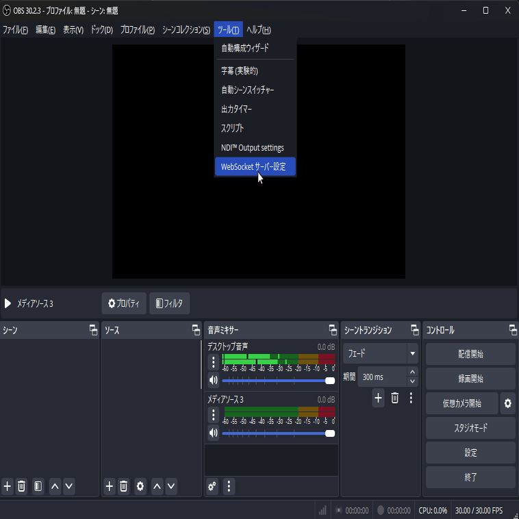OBS起動するとまず初めに上にあるツールというコマンドを選びプルダウンしたメニューから"WebSocketサーバー設定"を選びます。