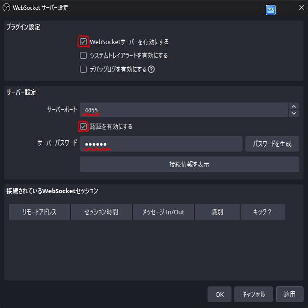先ほど設定したOBSのwebSocketサーバーのパスワードを打ち込みます。
