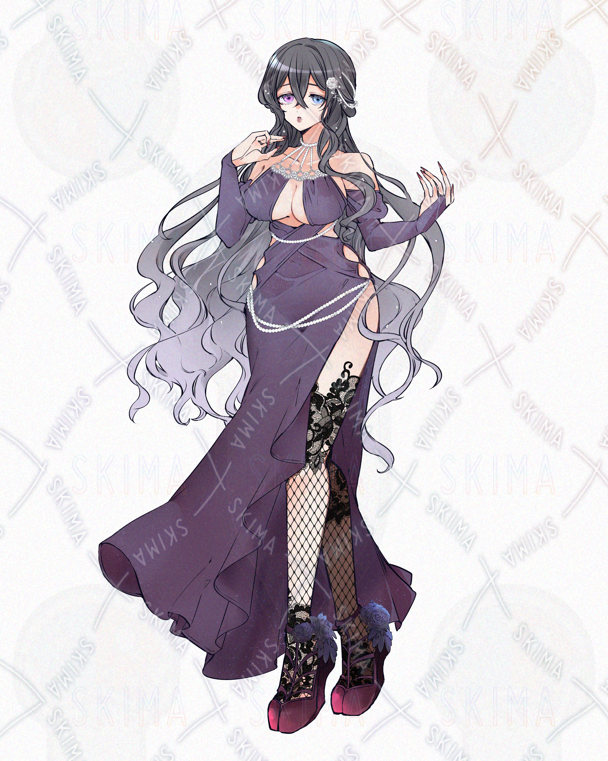 セクシーなドレスを着た妖艶な雰囲気のあるたれ目でオッドアイの悪魔イメージの女性です。
