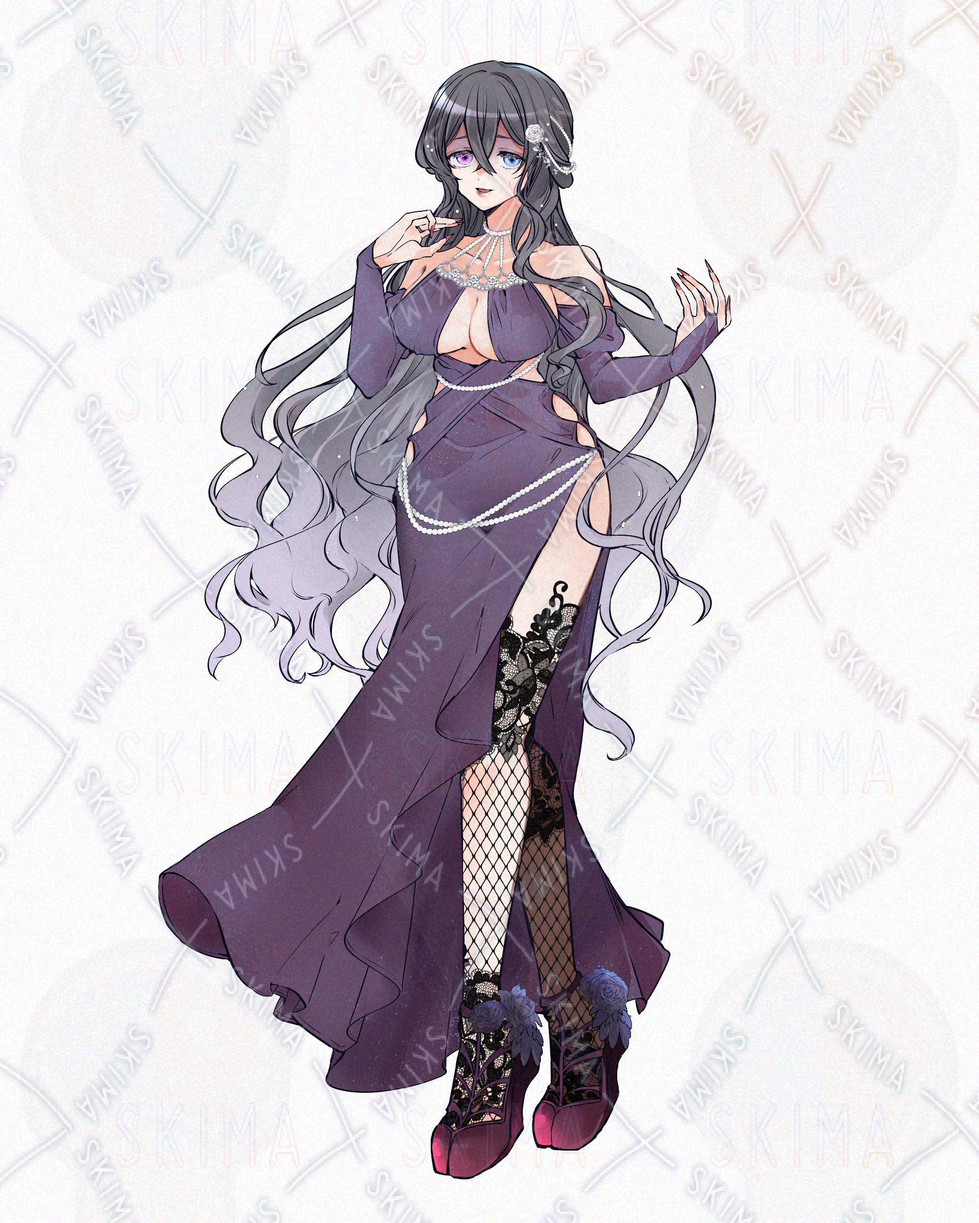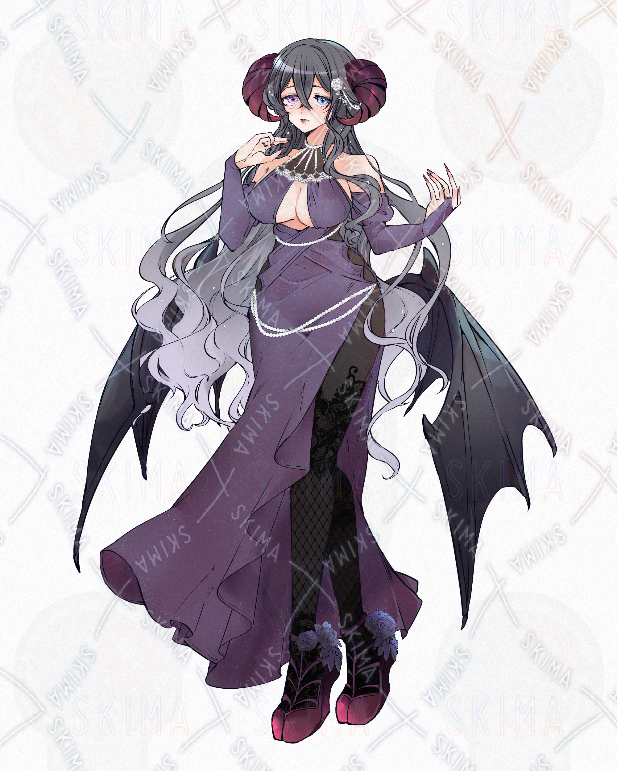 全身立ち絵 女性/悪魔/妖艶/翼/羽/ヤギ爪/ドレス/オッドアイ/網タイツ