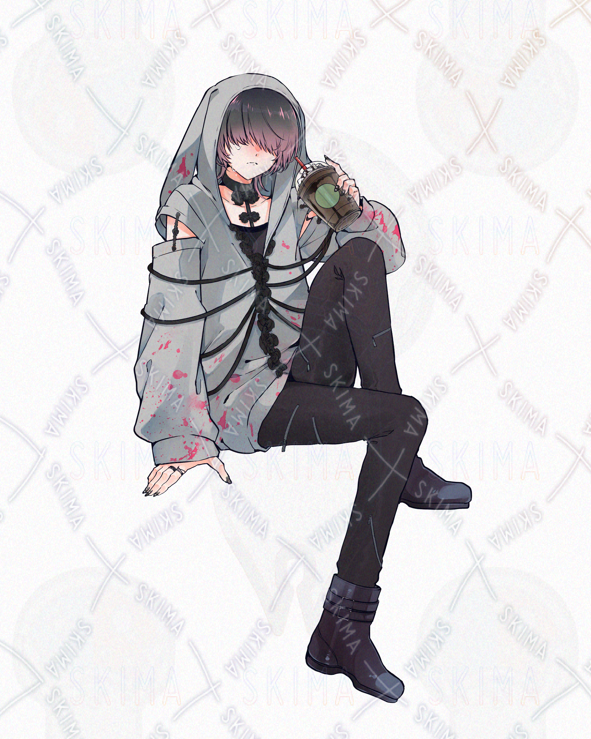 全身立ち絵 中性的/女性/男性/ピンクグレー髪/ブーツ/黒ネイル/地雷系/メカクレ/両目目隠れ/片目/舌ピアス/ヘアピン/売人/骨ハーネス
