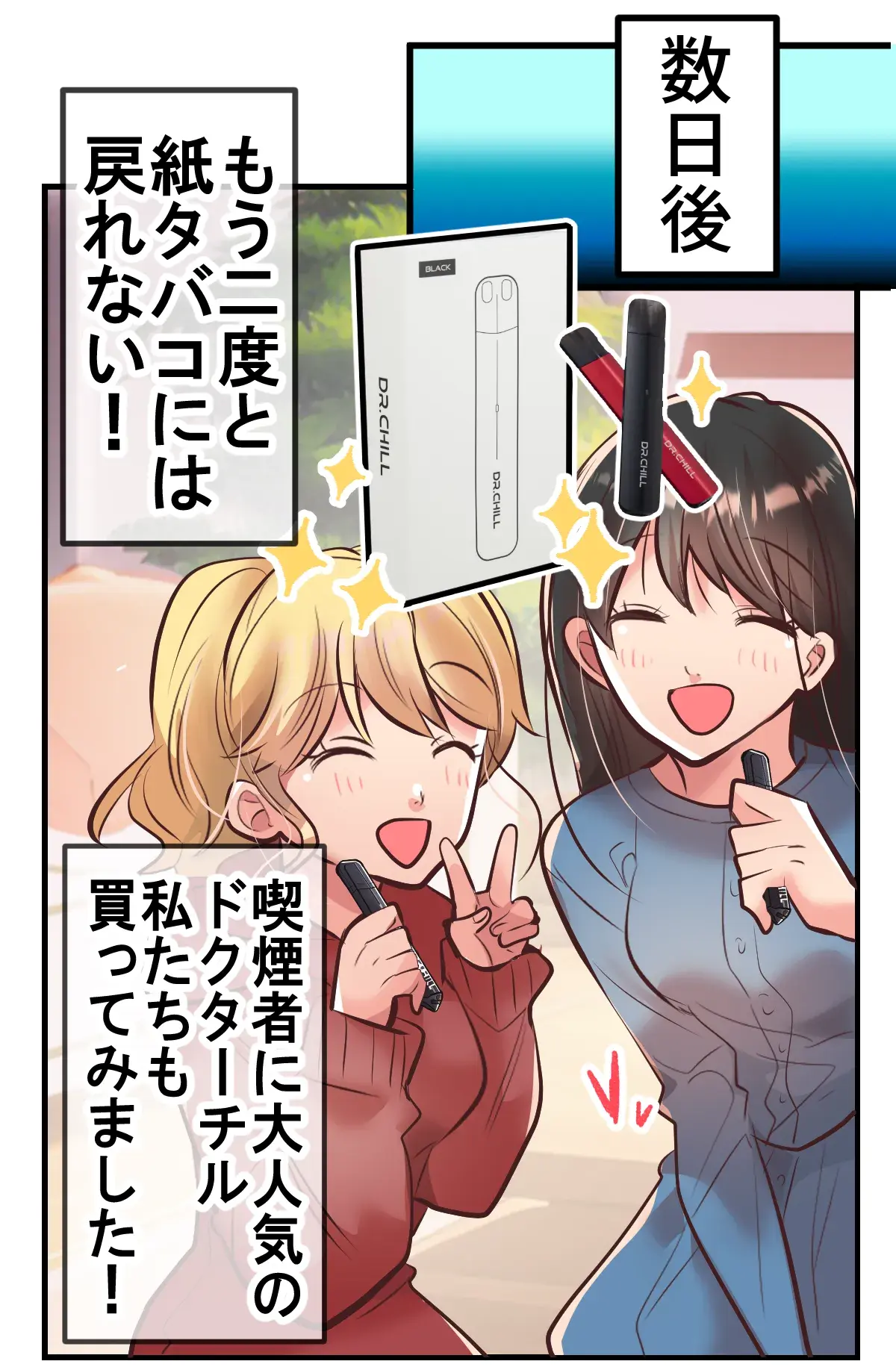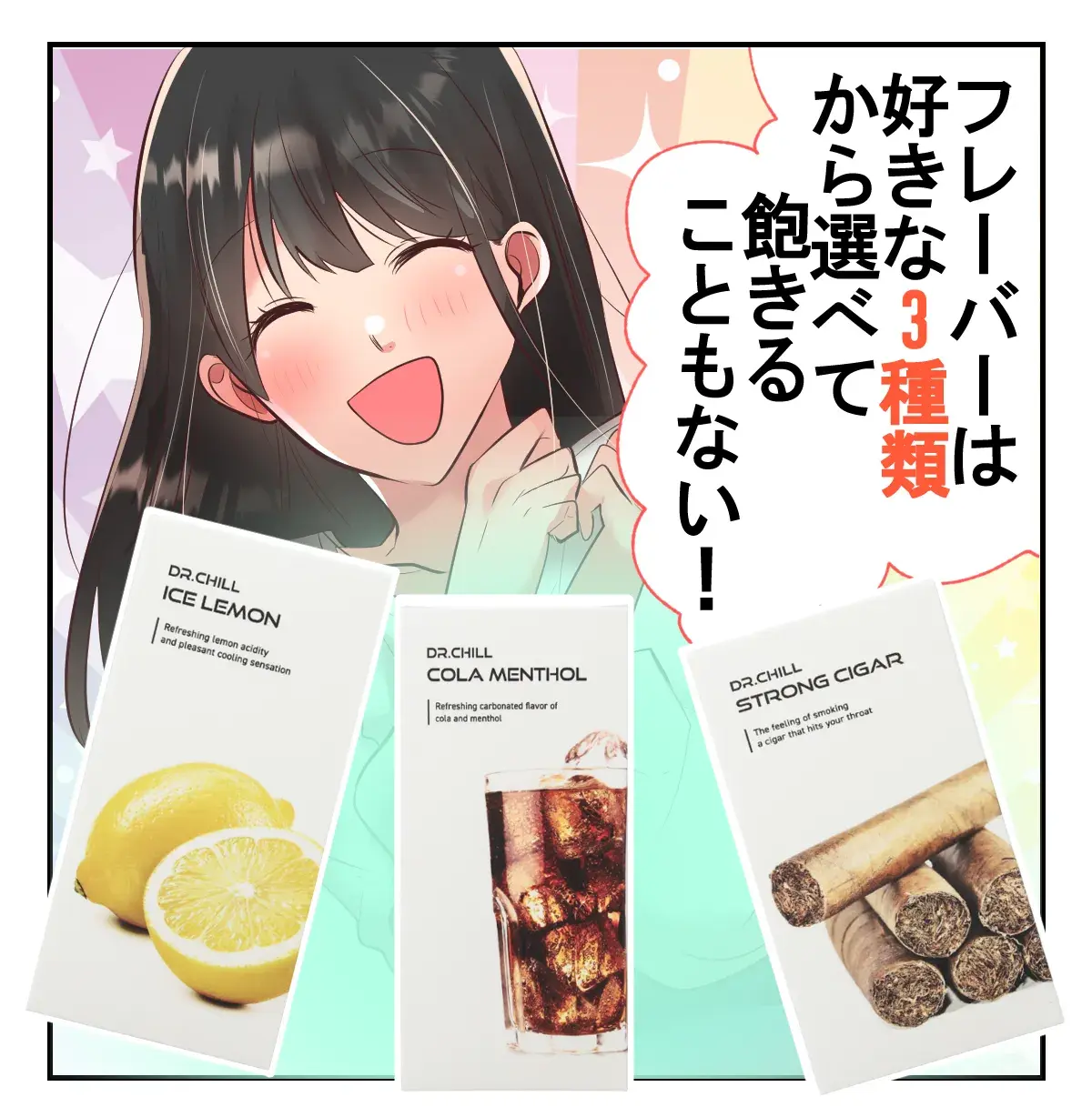 私は1日2箱以上吸うヘビースモーカーでしたが、今ではドクターチルだけで満足できてます!最初吸った時、予想以上に味が美味しくてびっくりしました。個人的にはレモン味が大好きです。特にいいのが超大容量で長持ちするので乗り換えてよかったです!