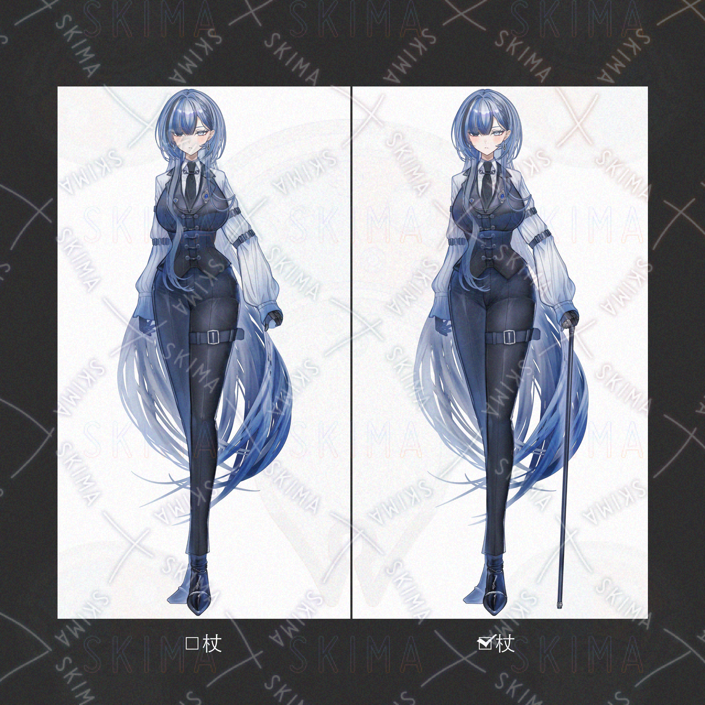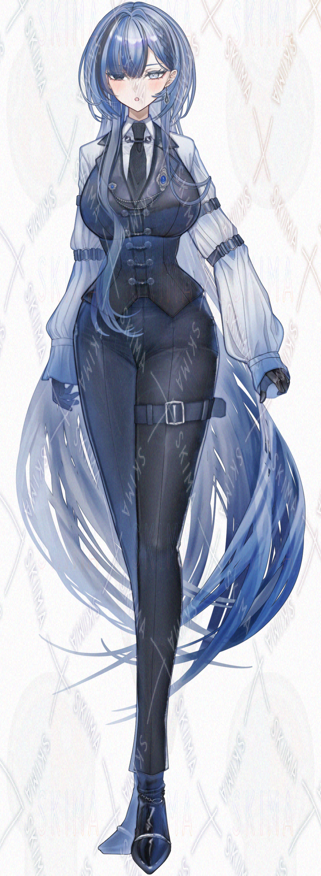 青髪/オッドアイ/ロングヘア/スーツ/ネクタイ/革手袋/女性/黒/白/青