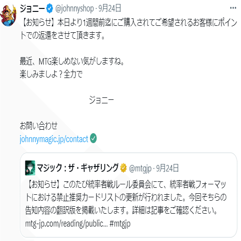 正直大きなお店はもちろん大打撃だし、中規模のお店でEDHに力を入れてたら禁止カードが複数種類複数枚在庫あります~なんてのもザラだと思うので、一晩で十万円以上の損失・・・とか「マジック取り扱いやめるか~」となりかねない。もうちょっと考えてくれ~!