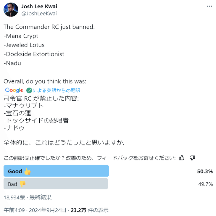 (まあEDHはウィザーズが禁止制限に責任を直接もって無いという所も問題な訳だけど