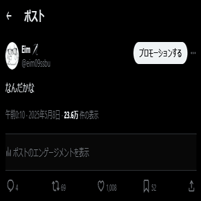こんにちは、最近自分のひらがな5文字のツイートが1000いいねに到達しててびっくりしました、Eimです。