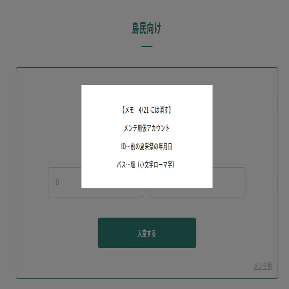 豊かな自然をメインに据えた観光地としてやっているようで、いろんな情報をここから知ることができるのですが、ただひとつ「島民の掲示板」というコンテンツだけがIDとパスワードを求められて見ることができません。