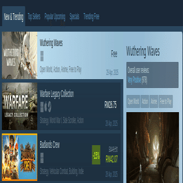 最後に、Steamストアのメインページの「New & Trending」などのタブからとれたての新作を探すこともあります。