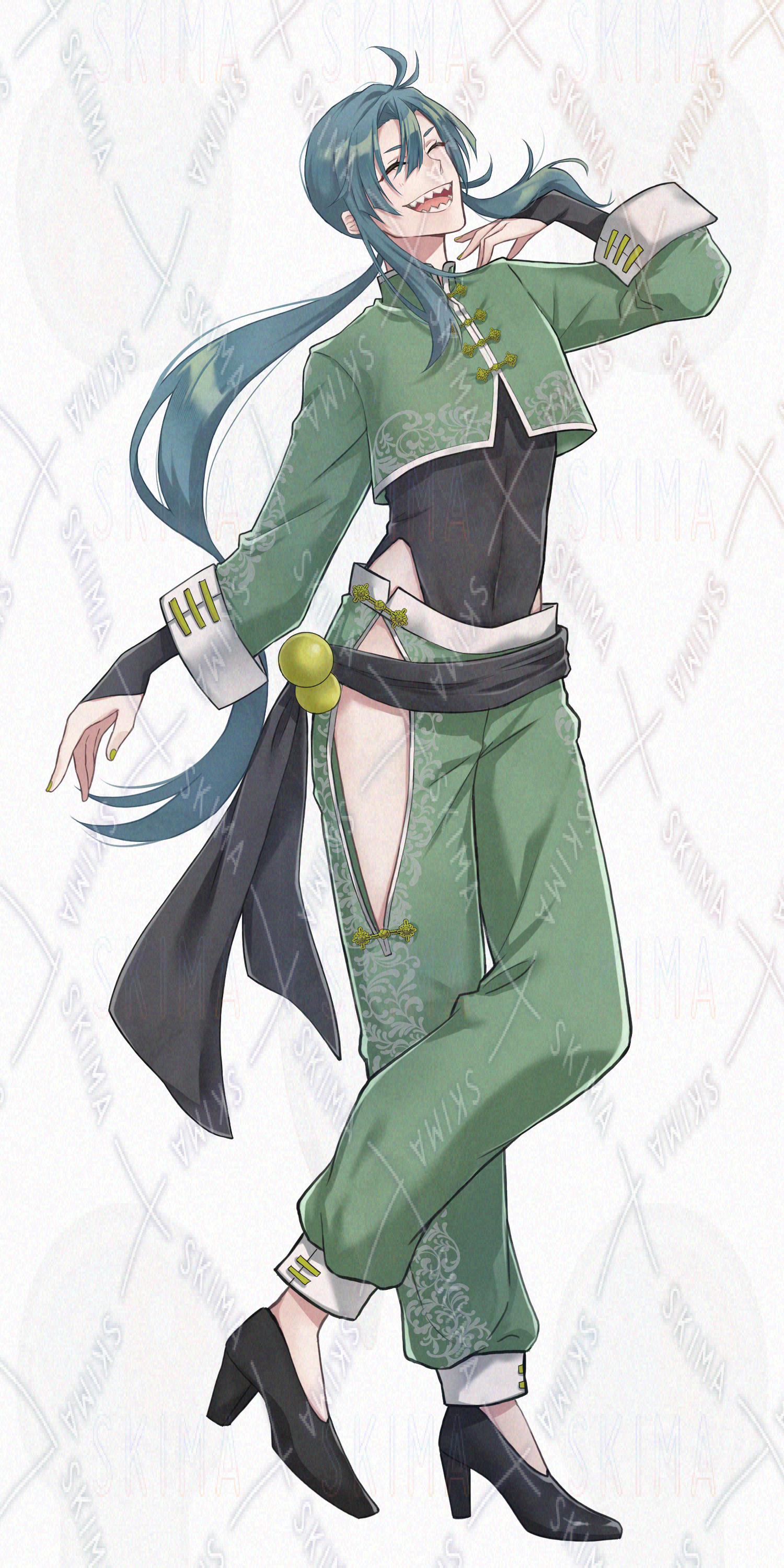 青年/チャイニーズ/中華/緑髪/長髪/ギザ歯/