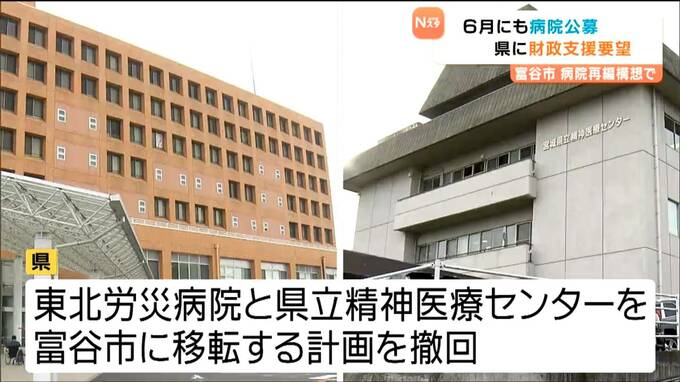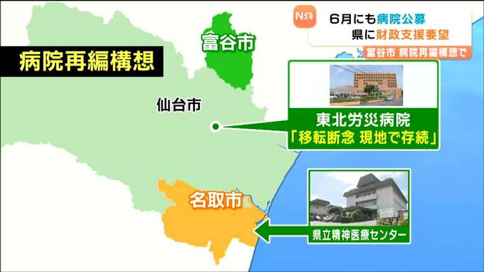仙台医療圏の4病院再編構想で宮城県は先週、東北労災病院の富谷市への移転を断念しました。これを受け、富谷市は市に移転する総合病院の公募を6月にも始める予定で、12日、周辺の自治体とともに宮城県に財政支援を求めました。