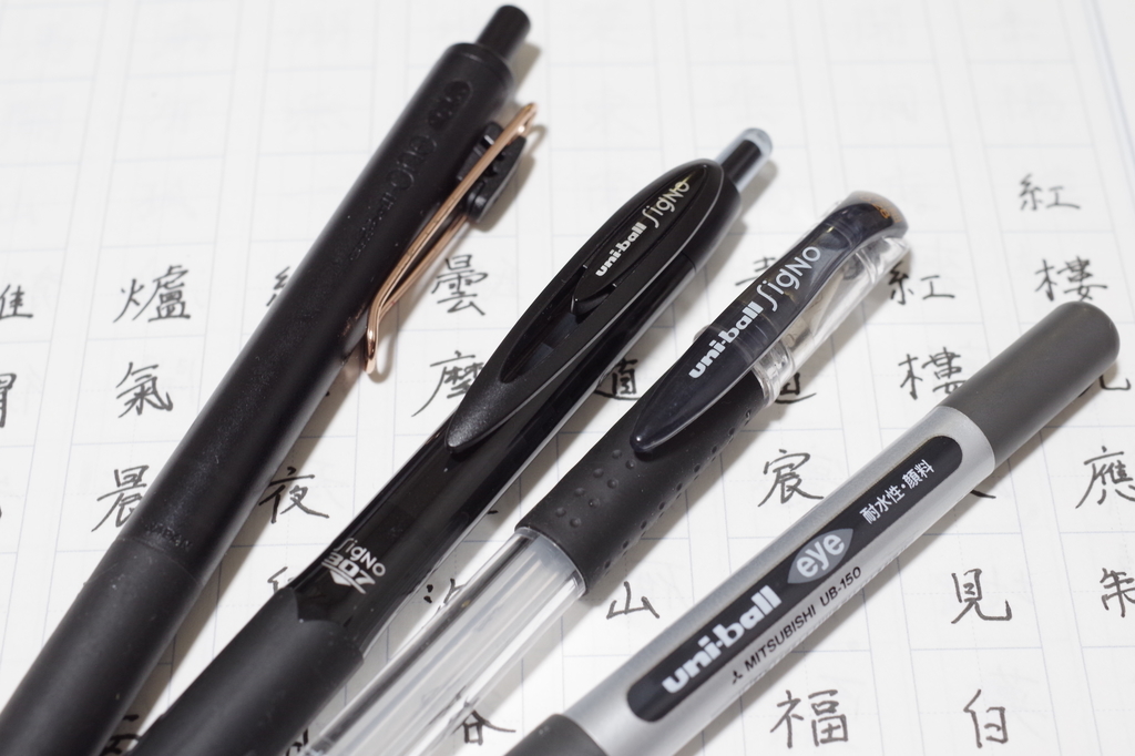 少し打っ立て(線のスタート)でインクがドバッと出がちで、フローもシグノに比べるとそこまで安定していないので、書きやすさ・字の綺麗さという点ではシグノやアイに劣りますが、なにより書いた瞬間「何これ!?」と驚いてしまうほどの黒さ、一度は味わってみてください。