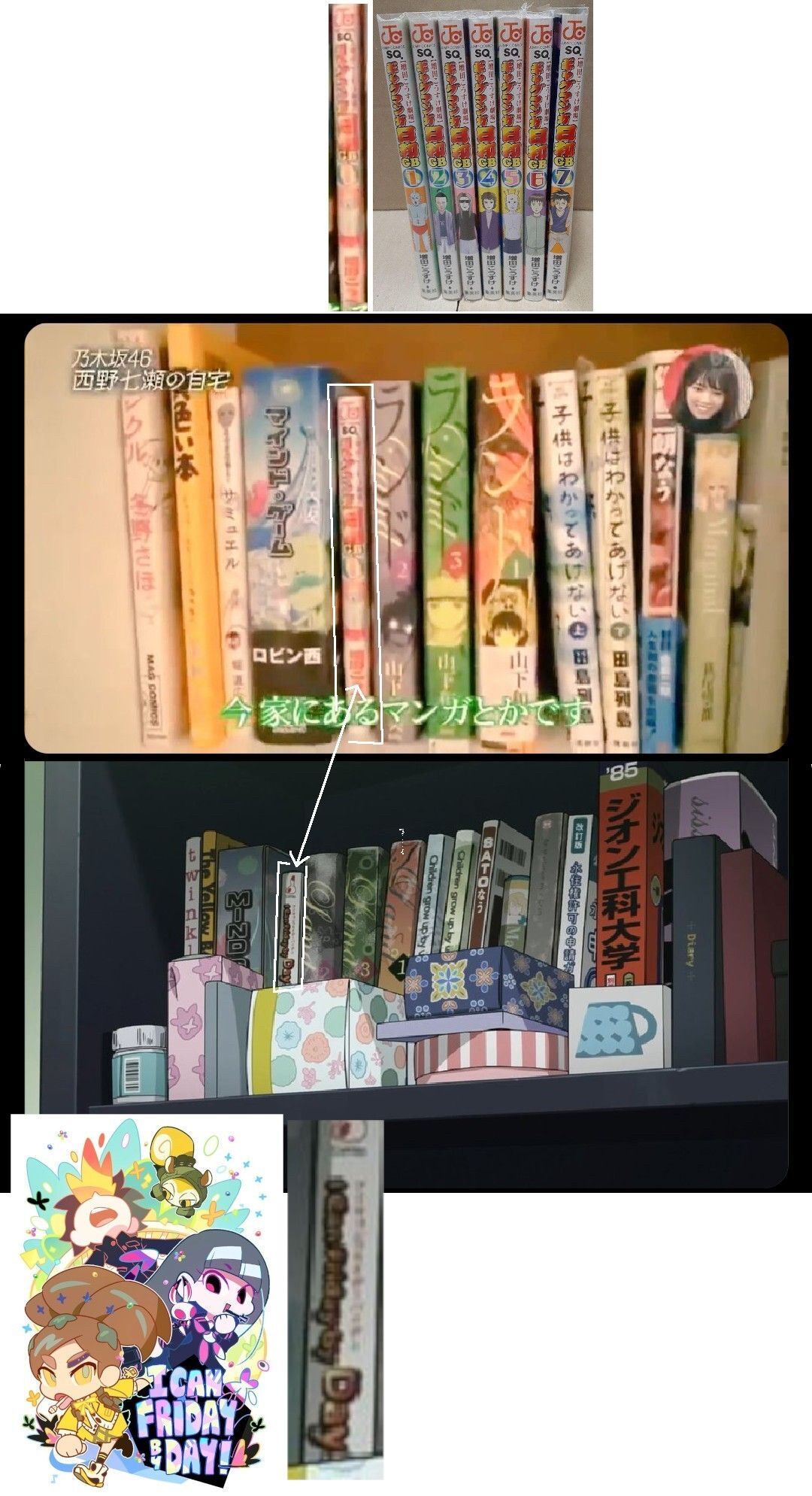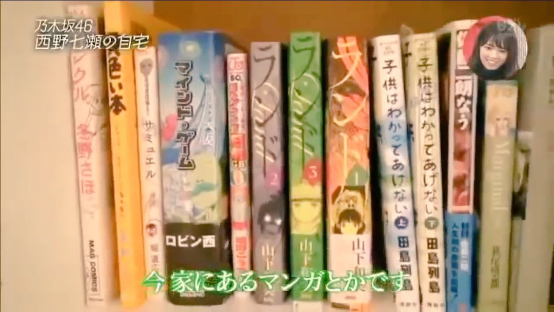 西野七瀬の本棚にある『ギャグマンガ日和』を