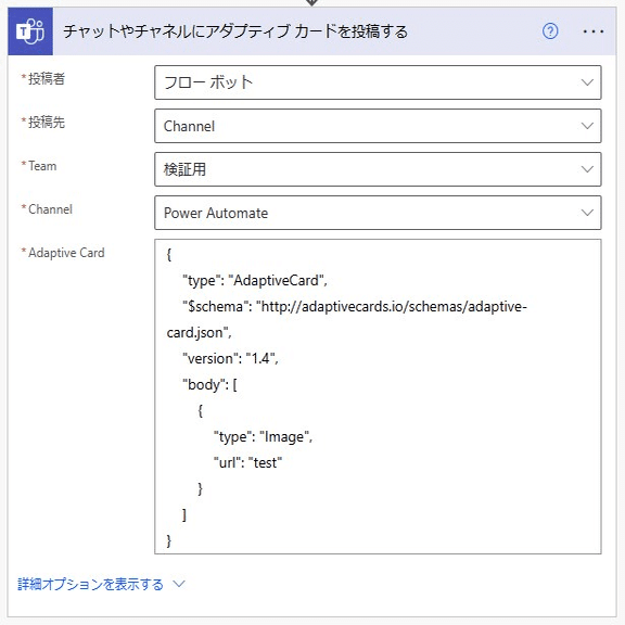 続いて、「Teams:チャットやチャネルにアダプティブカードを投稿する」で、アダプティブカードデザイナーのJSONを(*゚▽゚)ノ□ペタッ