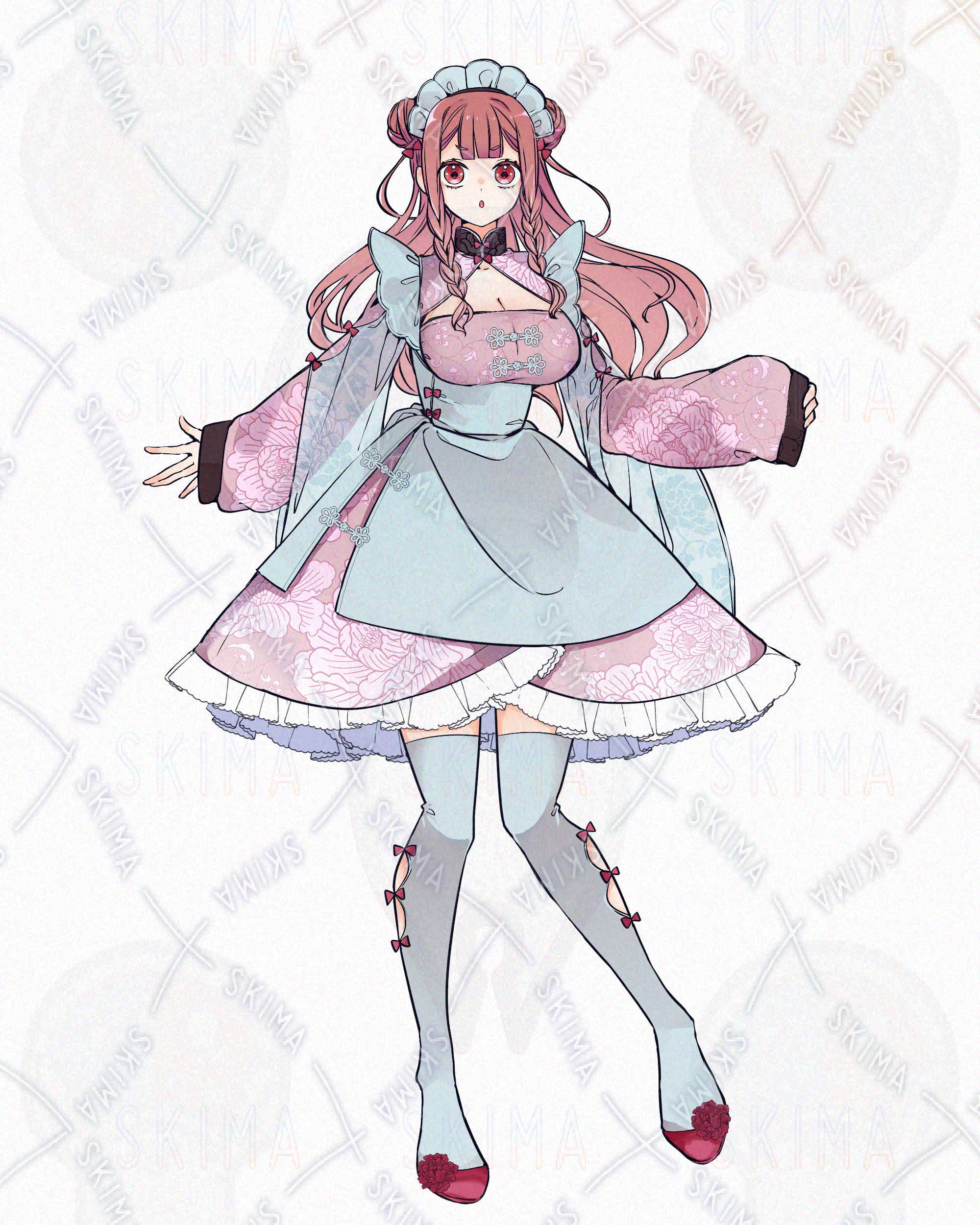 全身立ち絵 女性/少女/チャイナ服/中華服/メイド服/ニーハイ/リボン/赤/ピンク/八重歯/三つ編み/ミニキャラ/SD
