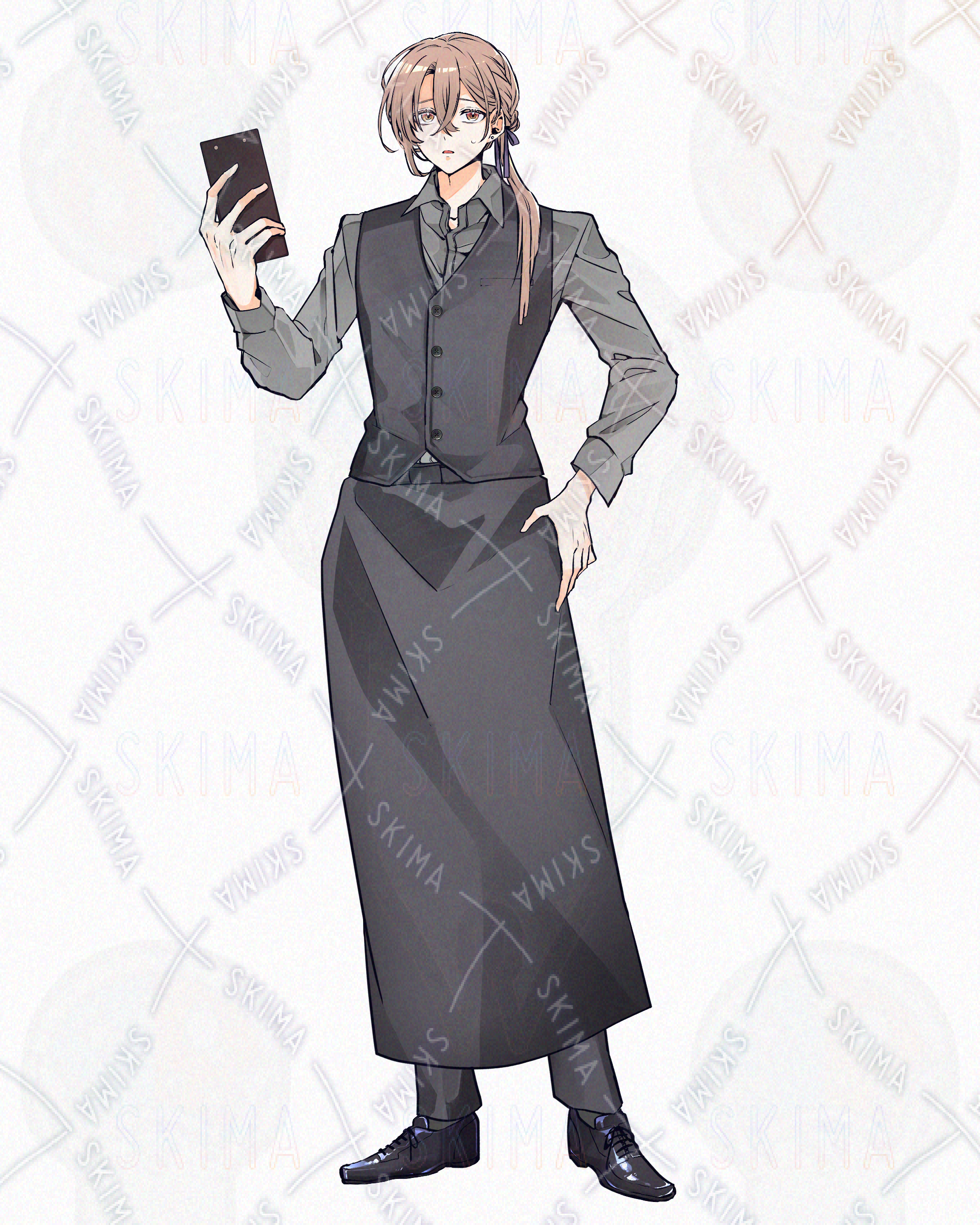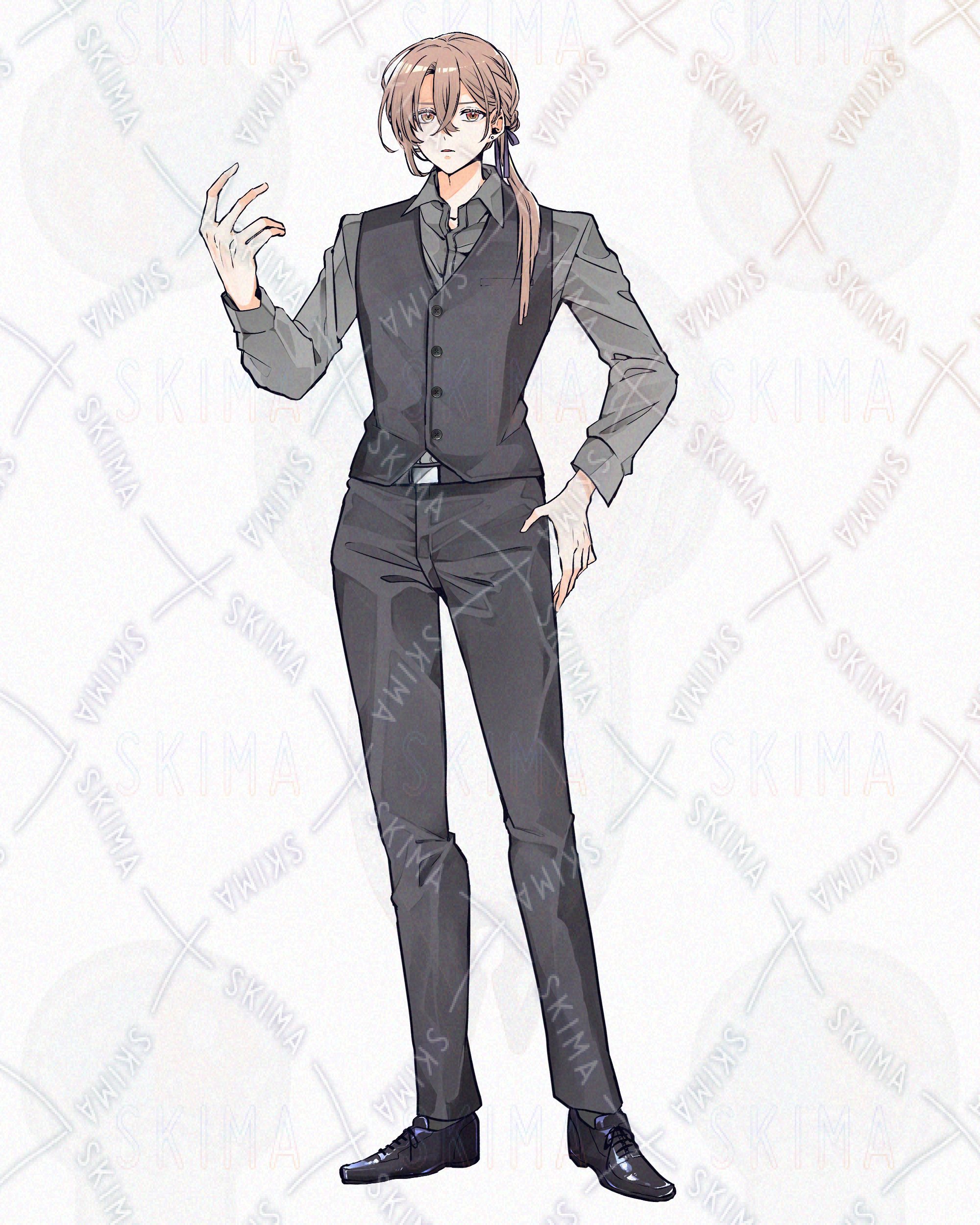全身立ち絵 男性/茶髪/ミルクティー色/ベスト/編み込み/リボン/サロンエプロン/腰エプロン/ソムリエ/バーテンダー/ウェイター/ピアス/スーツ
