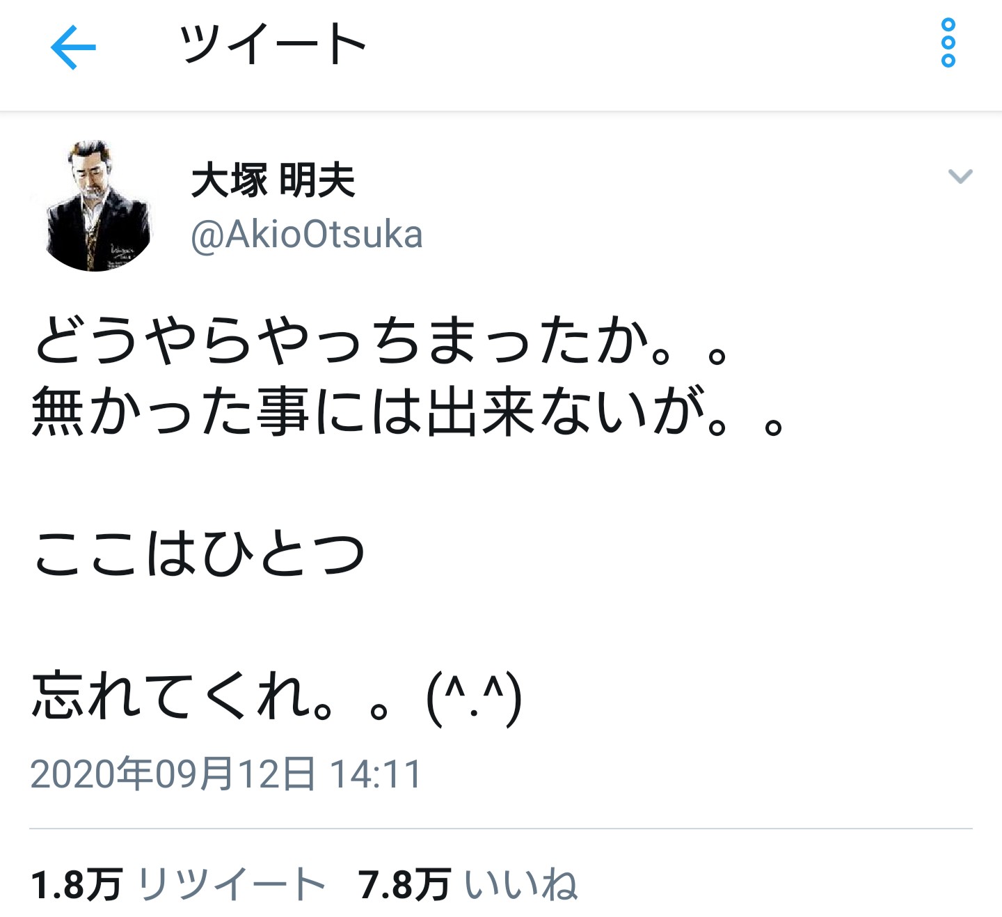 親父の大塚周夫が亡くなった時にコスプレイヤーかなんかの若い女が勝手に大塚明夫と勘違いしてこの前お仕事ご一緒したばっかりなのに残念ですってツッイターで呟いてて笑顔マーク付きで許してた漢だからね