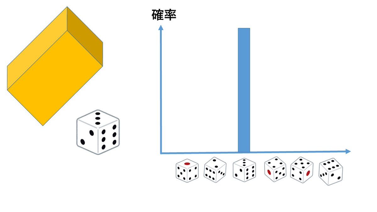 各目の出る確率は1/6で、一様分布でしたが、箱をとってサイコロを観測して3の目が出ていれば、確率分布は3の目にだけ集中して他の目は零になります。これが「確率分布の収縮」であり、そして当たり前ですが、この確率変化はニュートン方程式に従いませんよね。 pic.x.com/9y9wy0SjSx