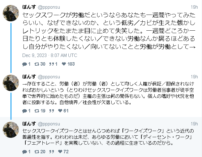 性売買が女性差別・性暴力・支配と搾取・組織的暴力(ヤクザや腐敗した権力者など)と密接な関連を持つ点、 やってみろと言う人にも、その従事者が居る点、 弱年層が誘導されやすく、有害性を認識するまで時間がかかる点、 などを無視する「セックスワークイズワーク」の賛同男性による詭弁の例。 twitter.com/ppponsu/status… pic.twitter.com/GDSffERqEk