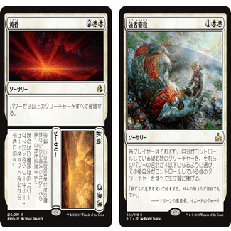 どちらも一定以上のパワーを持つクリーチャーに対する罰のような全体除去であり、白らしいカードだ。
