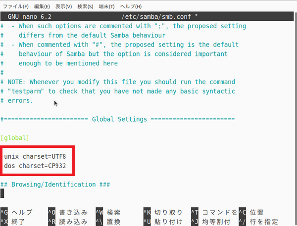 インストールが終われば samba のファイルを修正しておきます、文字化けを防ぐため念のため文字コードを設定しておきます。