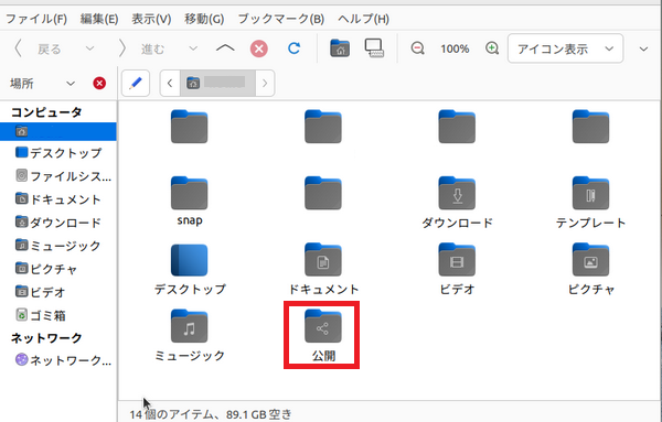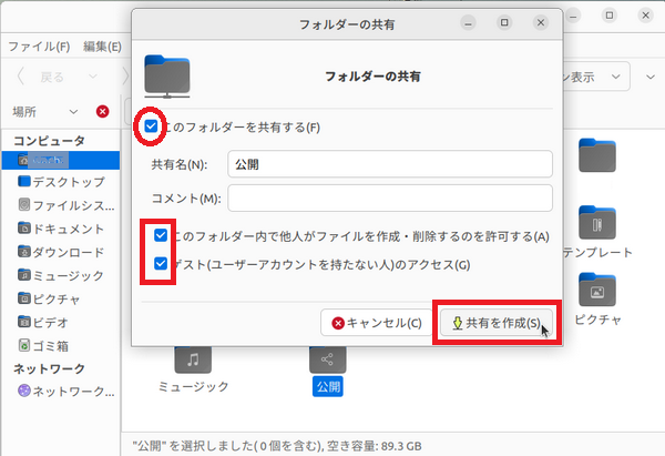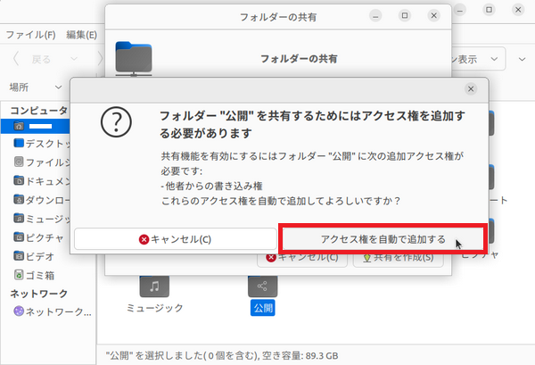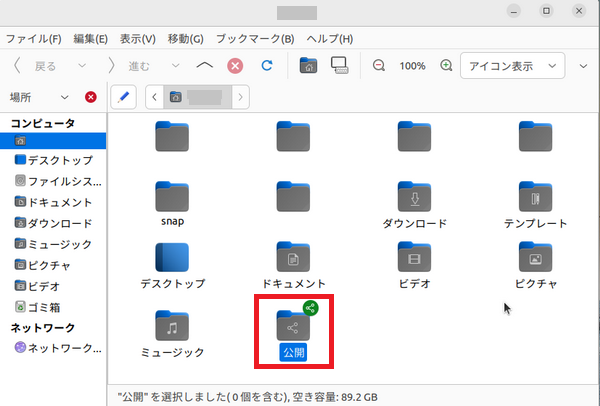 Linuxの方には「公開」というフォルダーがあるのでこれを共有することにしました。