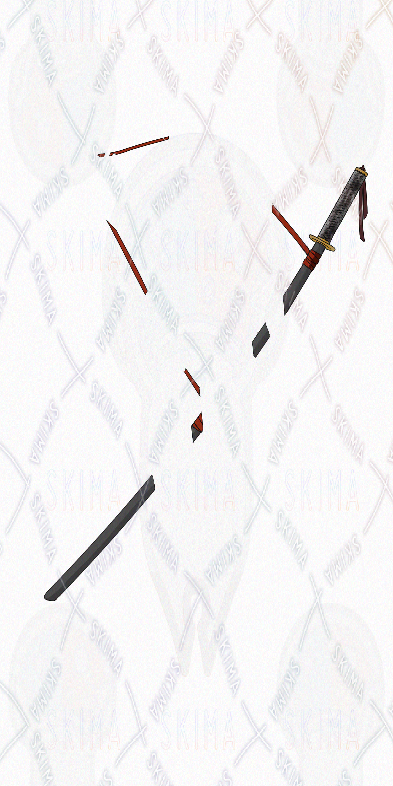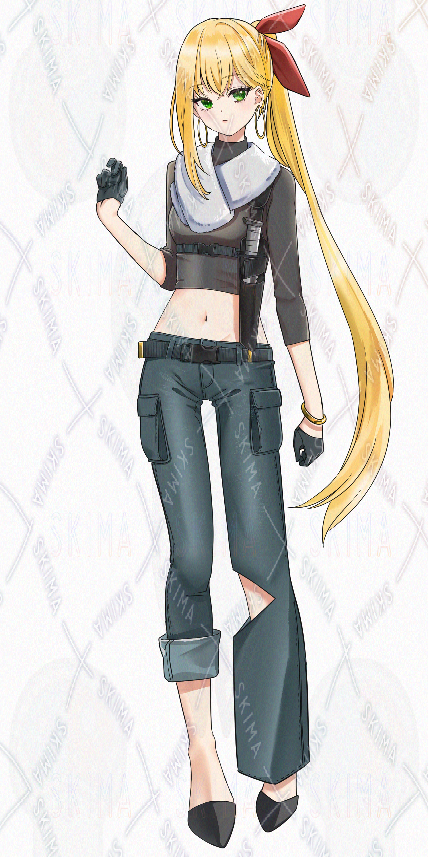 女の子、金髪、ポニーテール、、緑目、赤リボン、刀、ジーンズ、デニム、へそ出し、アングラ、手錠、手袋、ナイフ、アウトロー