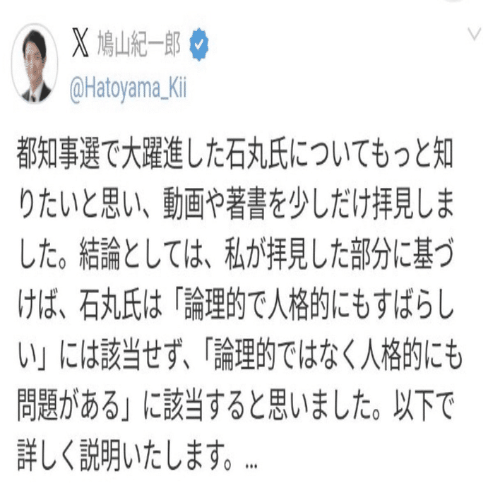 前回の都知事選直後、同じ国民民主党の鳩山喜一郎さんが、石丸さんに対して以下のような内容をXに投稿。