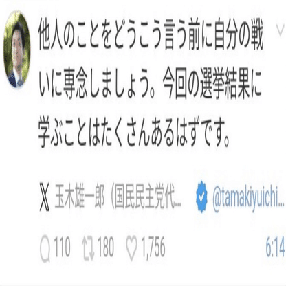 これは当然石丸支持者からしたら許せない内容であり、そもそも立場ある公人がするようなレベルのコメントではないわけだが、玉木さんはこれに対して以下のようにコメント。党としては都知事選は小池さんを支援した中で、そして玉木さんも代表という立場にあり各種発言・発信には十分に注意しないといけない中で、このように毅然とふるまえるのが、玉木さんの誠実さを表していると感じませんか。