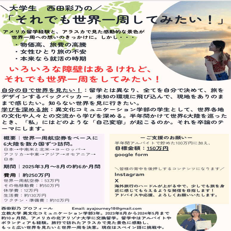 まだまだ世間を知らない未熟な大学生かもしれないけど、この「今」しか感じられない何かがあると信じて、来年度休学して世界一周することを決意しました。