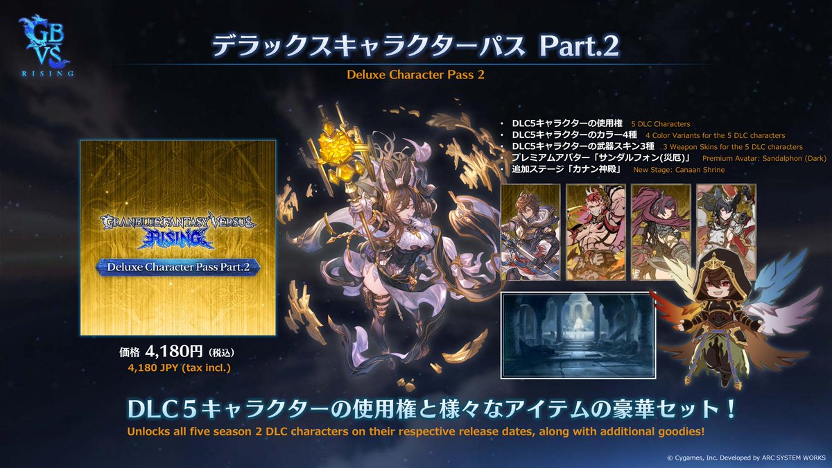 🪽🪨💥🦈🔫 「デラックスキャラクターパス Part.2」 シーズン2で登場する5キャラクターの使用権や、プレミアムアバター「サンダルフォン(災厄)」などがセットになった豪華版❗️ 現在配信中のサンダルフォンに加えて、明日より「ガレヲン」も使用可能になります💋 🔍詳細 rising.granbluefantasy.jp/dlc/character/… pic.x.com/hdNZntlEeS