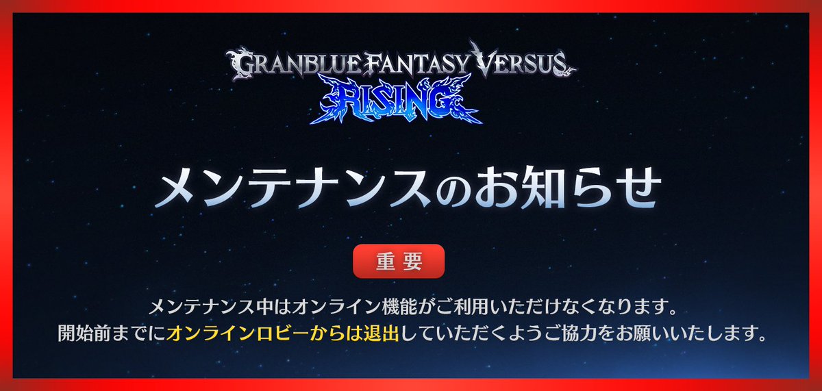 【メンテナンス時間変更のお知らせ】 Ver 2.10アップデートに伴うメンテナンスについて、ランクマッチの仕様変更の作業のため、メンテナンス開始時間を変更させていただきます。 変更前 5/28 10:00 変更後 5/28 0:00 なお、終了時刻は同日13:00を予定しております。 メンテナンス中はオンライン機能がご利用いただけませんが、「クイックマッチ」はお楽しみいただけます。 開始時刻の変更にあたり、お客様にご不便とご迷惑をおかけすることとなり、誠に申し訳ございません。 ▼Ver 2.10パッチノート rising.granbluefantasy.jp/news/detail/?i… #GBVSR