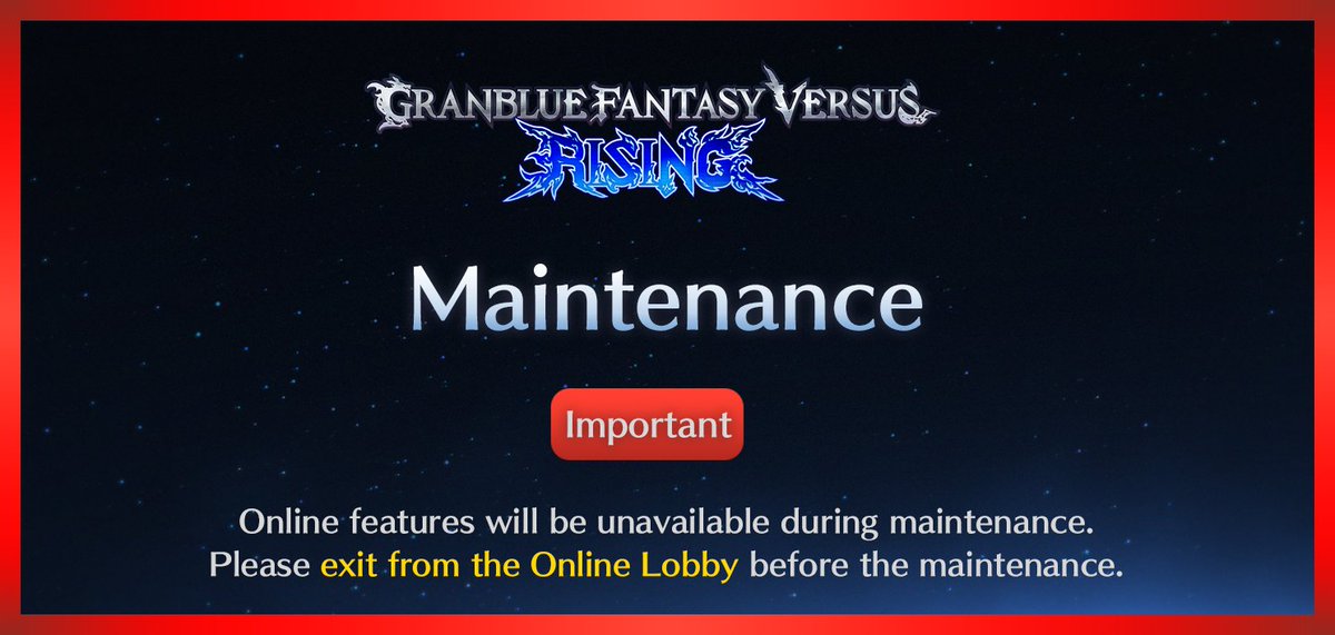 Maintenance has been extended to 8 a.m.–9 p.m., May 27 (PT) to implement Ranked Match changes. Online features (except Quick Match) will be unavailable during this time. Thank you for your patience! Version 2.10 Patch Notes: rising.granbluefantasy.jp/en/news/detail… #GBVSR pic.x.com/iBOHnvviNW
