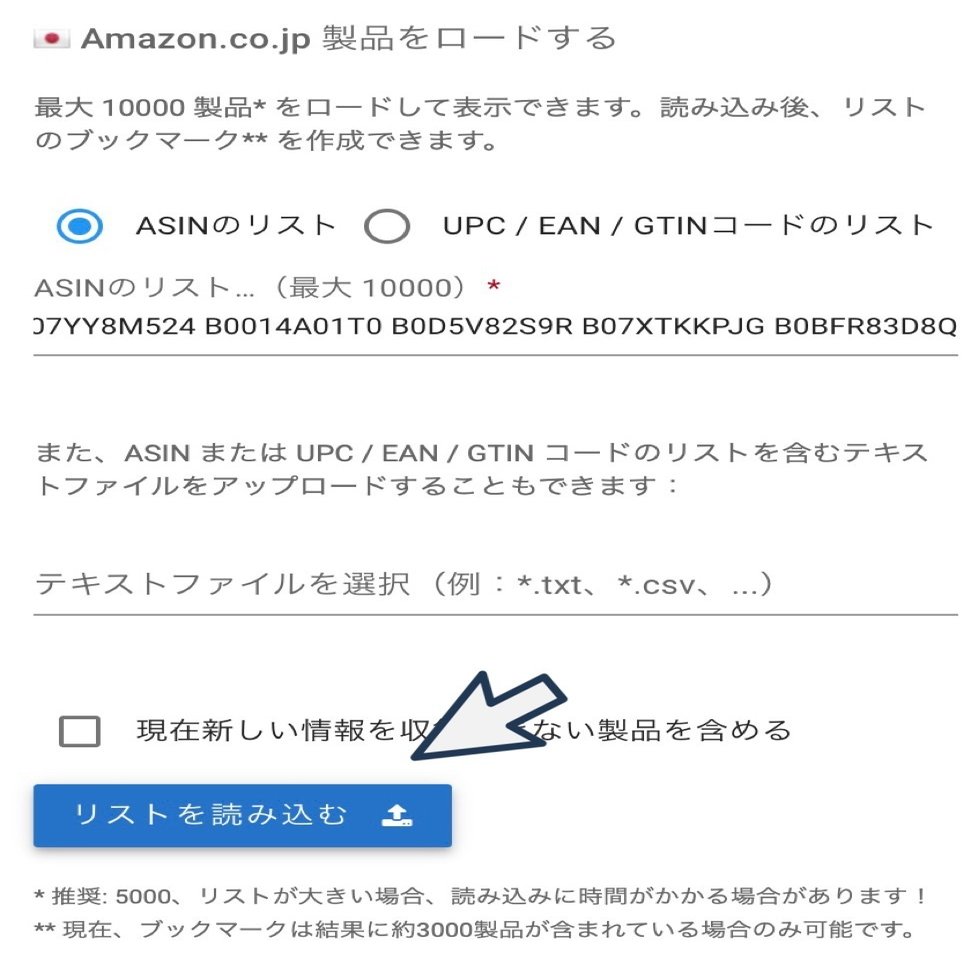 ASINのリストに、先ほどのASIN一括コピー機能を使ってコピーしたものを貼り付けます。